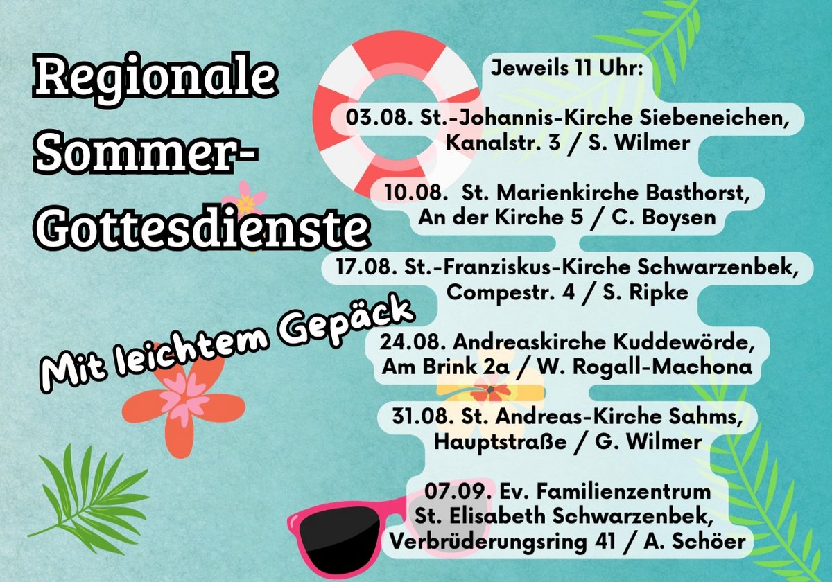 Regionale Gottesdienste im Sommer - an verschiedenen Orten - jeweils um 11 Uhr und im Anschluss Kirchkaffee: 03.08. Siebeneichen 10.08. Basthorst 17.08. & 07.09. Schwarzenbek 24.08. Kuddewörde 31.08. Sahms