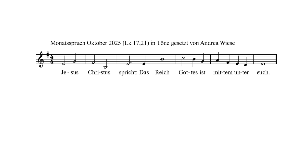 „Jesus Christus spricht: Das Reich Gottes ist mitten unter euch“, so lautet der Monatsspruch für den Oktober 2025, den ich wieder in Noten gefasst habe (s.u.). Ja, es gibt diese Momente, in denen „das Reich Gottes“ spürbar ist. Und es gab sie für mich verstärkt auch in meinen „Jubi-Tagen“. Momente, in denen Glaubensaussagen - in der Predigt gehört, in der Musik gesungene, gemeinsam gelebt - greifbar und reell werden und uns zu einer Gemeinschaft ohne Vorbehalte verbinden (können). Einfach so, von Mensch zu Mensch. Gott sei Dank.