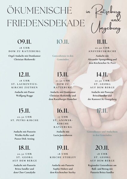 Im November finden im Rahmen der ökumenischen Fridensdekade in Ratzeburg und Umgebung vielfältig gestaltetet Gottesdienste an unterschiedlichen Orten statt.