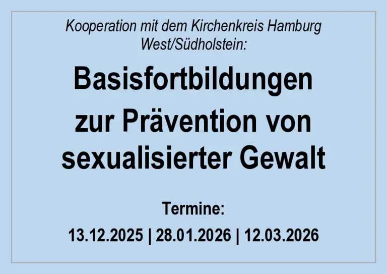 12.03.2026, 09.00-17.00Uhr | Stapelstraße 8b, 22529 Hamburg | Anmeldungen senden Sie gerne per Mail an: praevention@kirchenkreis-hhsh.de . Anmeldeschluss: 26.02.2026