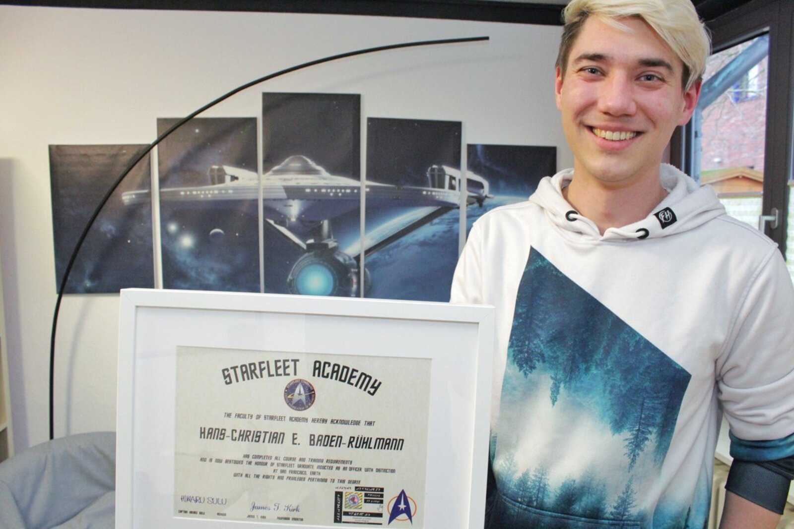 All diese Vorlieben spiegeln sich auch in Baden-Rühlmanns Pastoratsbüro in Lauenburg wider. Über der Besprechungsecke hängt ein riesiges Bild der U.S.S. Enterprise aus der Science-Fiction-Serie „Star Trek“. Im Regal daneben sitzen niedliche Pokémon-Plüschtiere. Der PC ist eher eine bunt-beleuchtete Gaming-Station, wie man sie aus manchen Streaming Zimmern kennt. „Gelegentlich spiele ich auch selbst noch Videospiele. In letzter Zeit häufiger ,Seven Days to die‘“, verrät der Pastor. Ein Computerspiel über die Zombie-Apokalypse. Mit den Computerspielen hätte er wieder angefangen, weil ihm sein neuer Job als Pastor im Probedienst in Lauenburg gerade wenig Zeit ließe für ältere Hobbies, so Baden-Rühlmann.