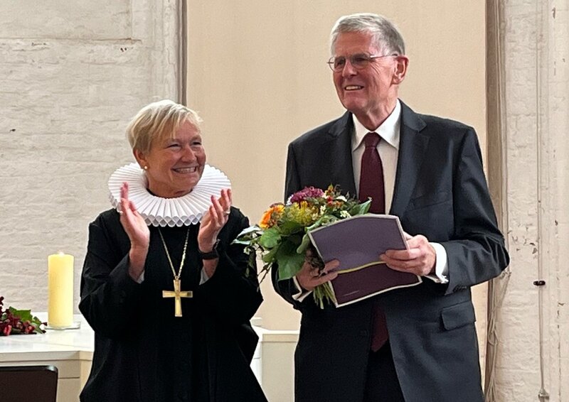 Kai Schröder würdigte die Bischöfin besonders für sein unermüdliches Streben für Gerechtigkeit: "Danke, dass Sie in Ihrer geradlinigen Art das klare Wort nicht scheuen. Danke, dass Sie mit so viel Kraft an Ihrer Kirche mitgebaut haben und uns bisweilen auch herausgefordert haben zum Guten, hinter dem Sie stehen, und zwar wie eine Eins.“