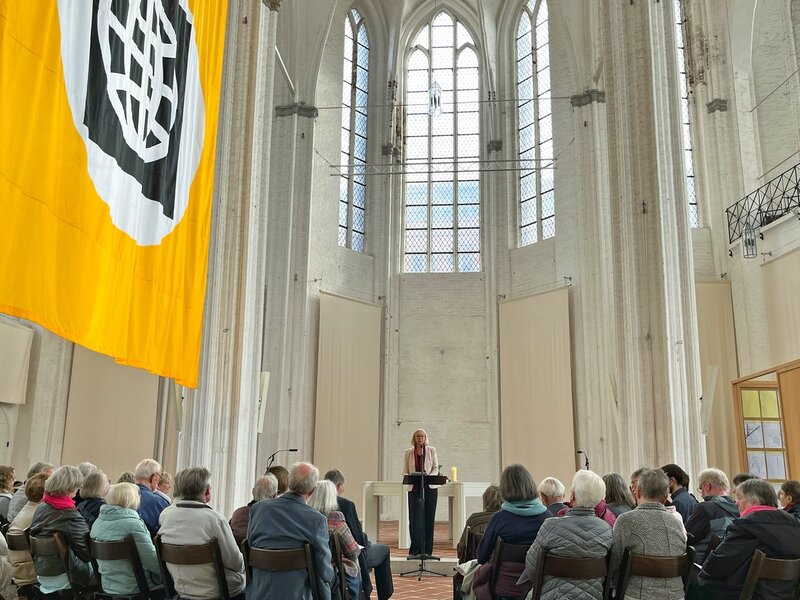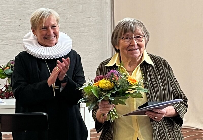 „Ihr seid das Salz der Erde. Ihr seid das Licht der Welt. Nichts weniger. Ich danke dem Herrgott, dass es Euch gibt. Denn ohne Euch wäre alles nichts“, richtete Kirsten Fehrs, Bischöfin der Nordkirche für den Sprengel Hamburg und Lübeck, eingangs ihre Worte an die beiden Preisträger. Sie bezeichnete Hella Fabricius als „Pragmatikerin mit Herz durch und durch“. „Wir beide kennen uns eine kleine Ewigkeit, über 35 Jahre. Ich kann mich nicht an eine einzige größere Aktion im Frauenwerk erinnern, an der Du nicht beteiligt warst.“ Fehrs hob das Engagement der heute 83-Jährigen im Ringen für den Frieden hervor: "So großartig klar und aufrecht ist diese deine hartnäckige Überzeugung, dass nach Gottes Willen Krieg nirgends sein darf.“