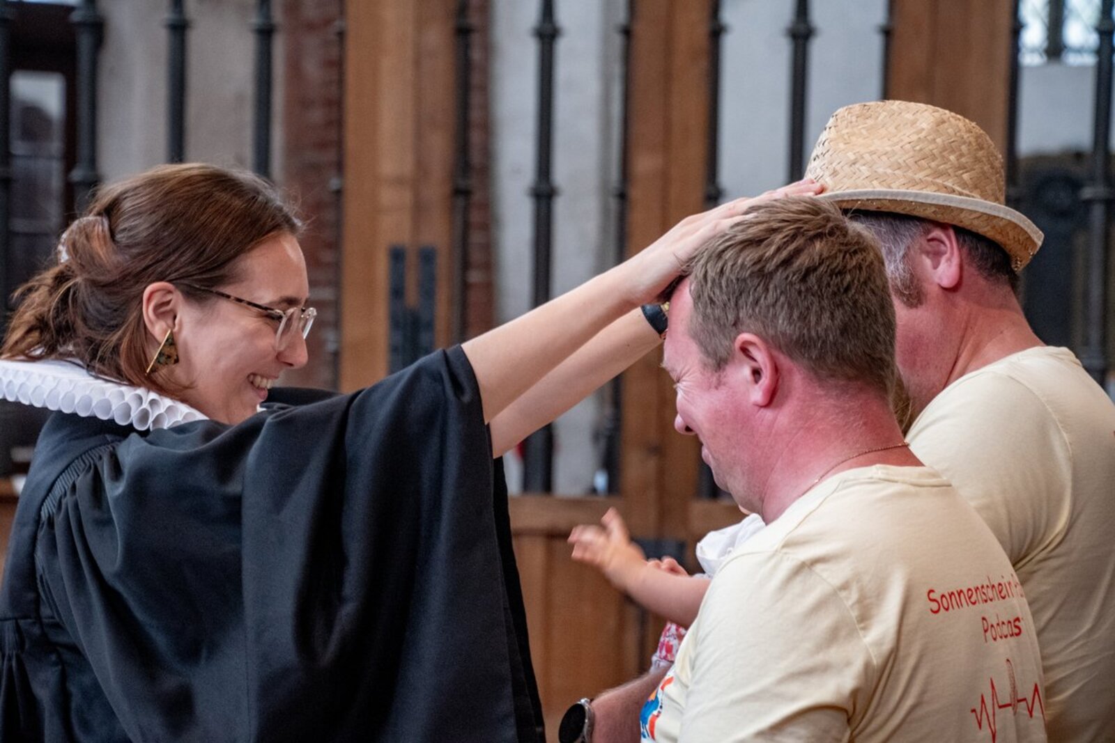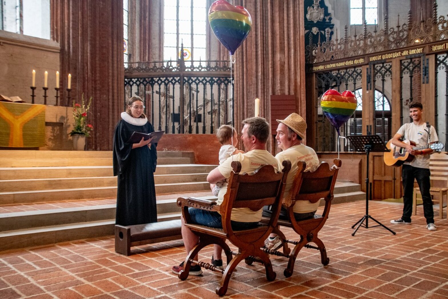 Unter den Teilnehmenden der Segensaktion: Thorsten und Danny. Das verheiratete Paar war gemeinsam mit seiner kleinen Tochter nach St. Marien gekommen, um sich als Familie Gottes Segen zusprechen zu lassen. „Wir sind beide gläubige Menschen und finden die Idee wunderschön“, sagten die beiden. Besonders dankbar seien sie, dass sich ihr größter Wunsch, ein gemeinsames Kind zu haben, durch die Adoption ihres „Sonnenscheins“ im vergangenen Jahr erfüllt habe. Pastorin Lilly Schaack fand in der kleinen Zeremonie für die drei die passenden Worte: „Euer Glück ist nicht selbstverständlich, da hatte jemand seine Hände im Spiel.“ Gemeinsam wurde eine Segenskerze - dekoriert mit einem Regenboden und drei Herzen - entzündet.