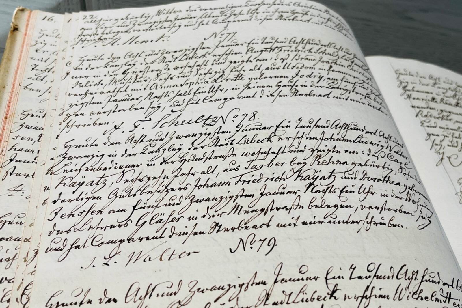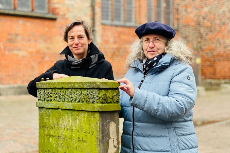 Für die 59-Jährige sind es Fälle wie der von Carl Kayatz, die ihr Forscherherz erwärmen. „Es macht mir einfach unglaublich viel Spaß, auf Spurensuche in die Geschichte einzutauchen.“ Und so kann ein Nachmittag im Stadtarchiv wie im Flug vergehen – ein historischer Eintrag führt zum nächsten und langsam entsteht ein Bild vor dem inneren Auge, was 1828 passiert sein könnte. Birgit Aschenbrenner, Mitarbeiterin des Stadtarchivs, beteiligt sich spontan an den Recherchen und sorgt immer wieder für Nachschub an Dokumenten, Einträgen und historischen Büchern. Sie findet heraus, dass Carl Kayatz Schüler des Katharineums war und deshalb wahrscheinlich bei seinem Lehrer zur Untermiete wohnte. Doch: „Sehr wahrscheinlich wurde Carl Kayatz gar nicht auf dem Jakobikirchhof beigesetzt, sondern auf dem Marienkirchhof. Später stand sein Grabstein dann auf dem Burgtorfriedhof“, berichtet Dr. Claudia Tanck. „Da der Grabstein keine Verwendung mehr auf dem Friedhof fand, entschied sich der damalige Pastor Ernst Jansen, ihn im Zuge der Umgestaltung des Jakobikirchhofs Anfang der 50er Jahre dort aufzustellen“, ergänzt Jakobi-Pastorin Bärbel Reichelt. „Mit ihm sollte daran erinnert werden, dass sich hier einmal ein Friedhof befand.“