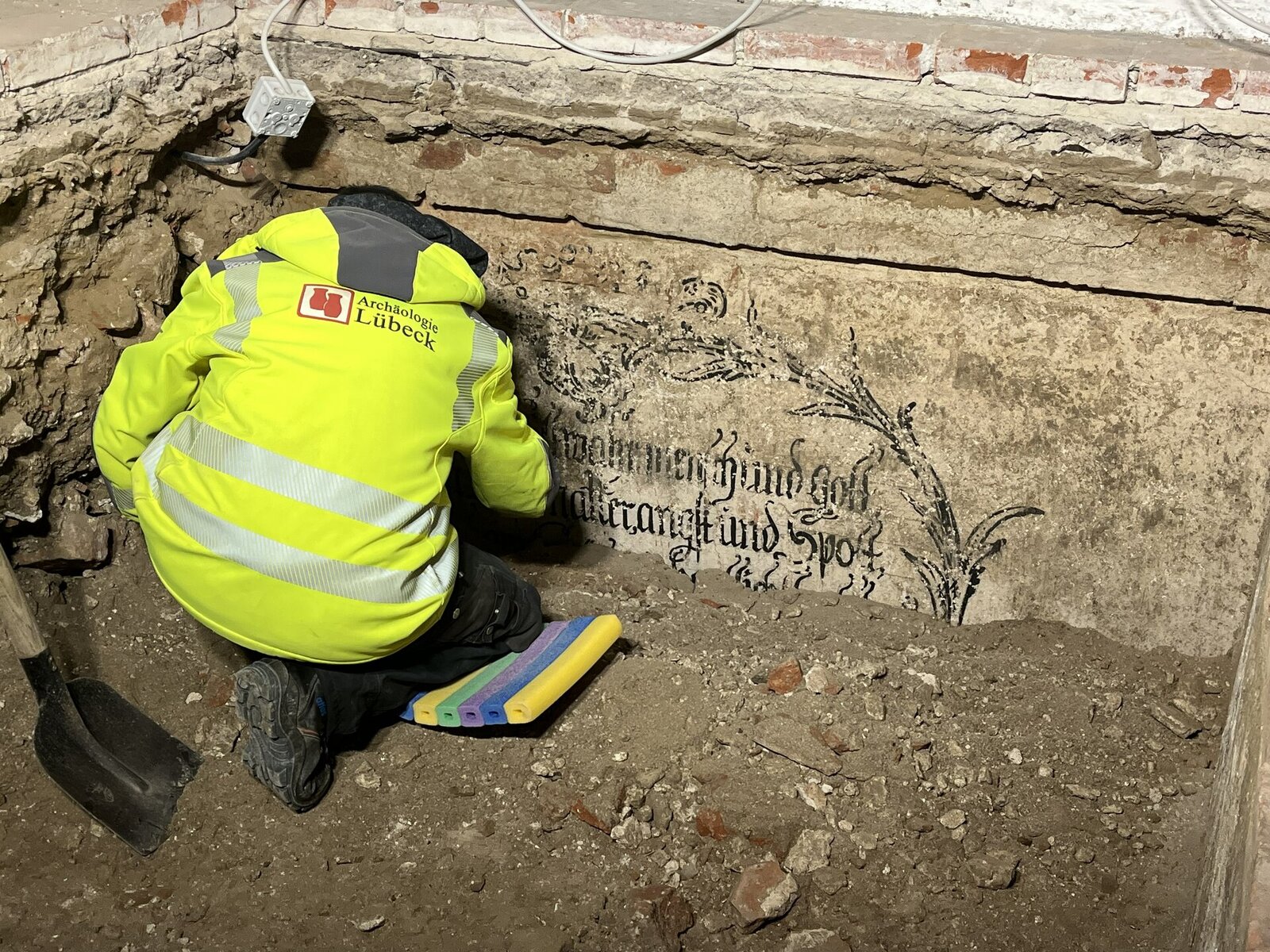 Freskenmalereien und Inschriften aus dem 17. Jahrhundert, Fundamentreste und Backsteinmauern: Mit Schaufeln und Besen legt das Team an mehreren Stellen im Kirchraum Fenster in die Vergangenheit frei; Einblicke in Jahrhunderte, in denen sich reiche Lübecker Kaufleute Grabstätten in der Kirche sicherten. Anlass für die Arbeiten sind die Vorbereitungsmaßnahmen zum Einbau einer neuen Fußbodenheizung.