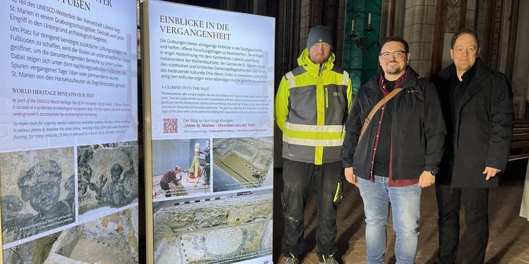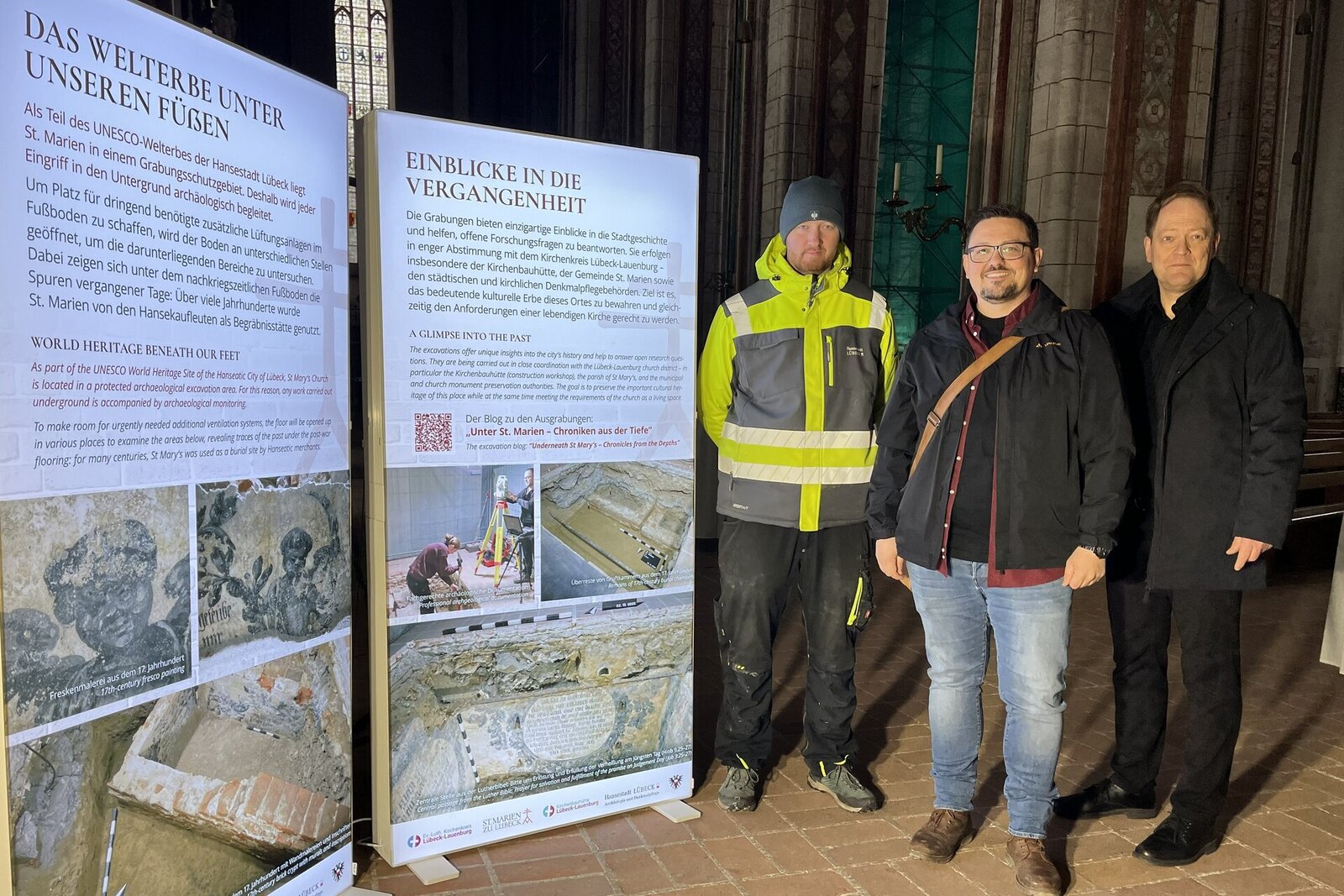 Lübeck. Faszinierende Einblicke in das historische Welterbe Lübeck liefern zurzeit archäologische Untersuchungen unter dem Fußboden von St. Marien in Lübeck. Im Fokus stehen dabei die historischen Grüfte und deren Bedeutung als Bestattungsorte der Hanse-Eliten. Ganz neu: Über beleuchtete Infotafeln erfahren Besucherinnen und Besucher mehr über die Arbeiten der Archäologen.