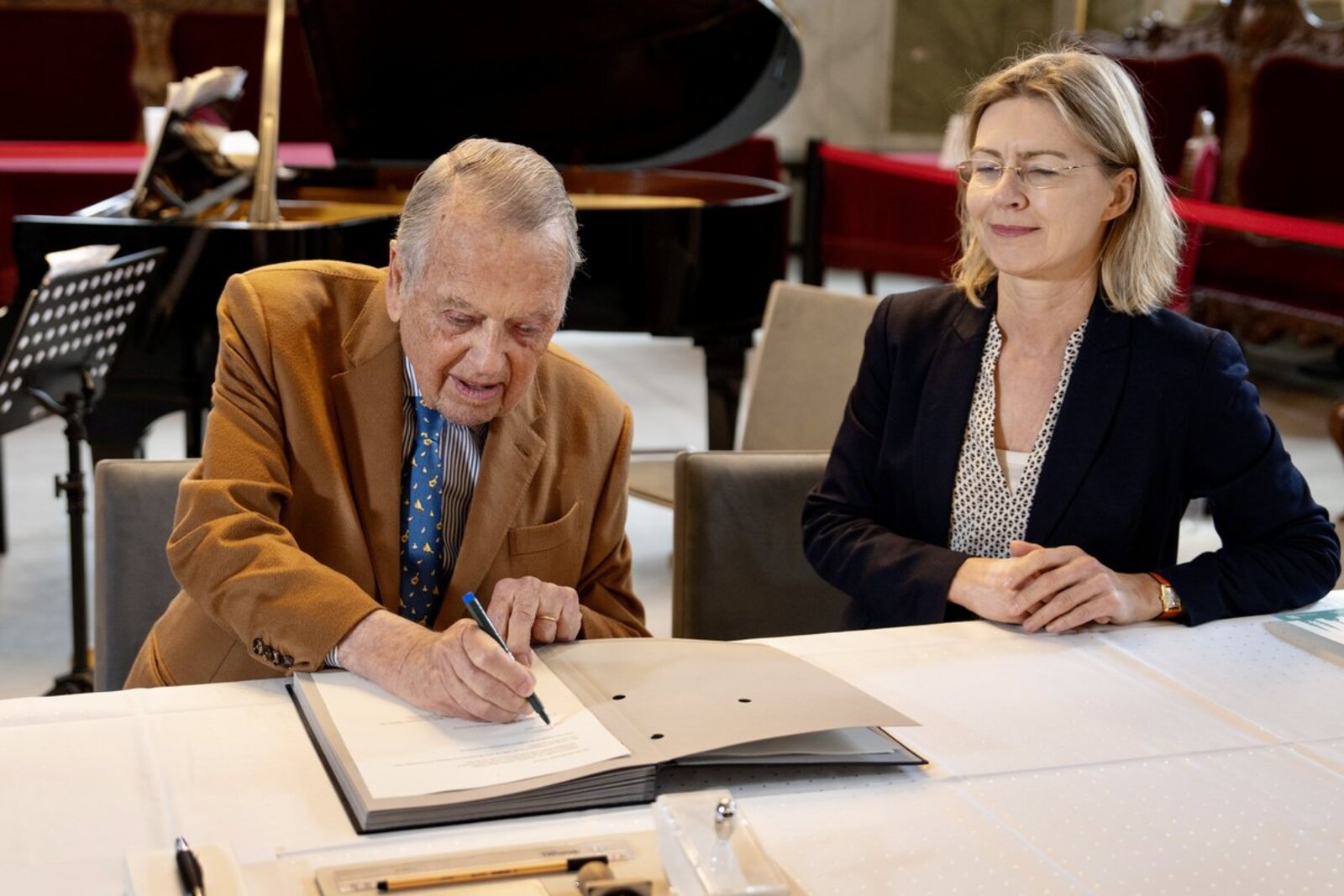 Dr. Arend Oetker unterzeichnet die Urkunde im Beisein von Dorothee Hassenpflug-Hunger vom Landeskirchenamt.