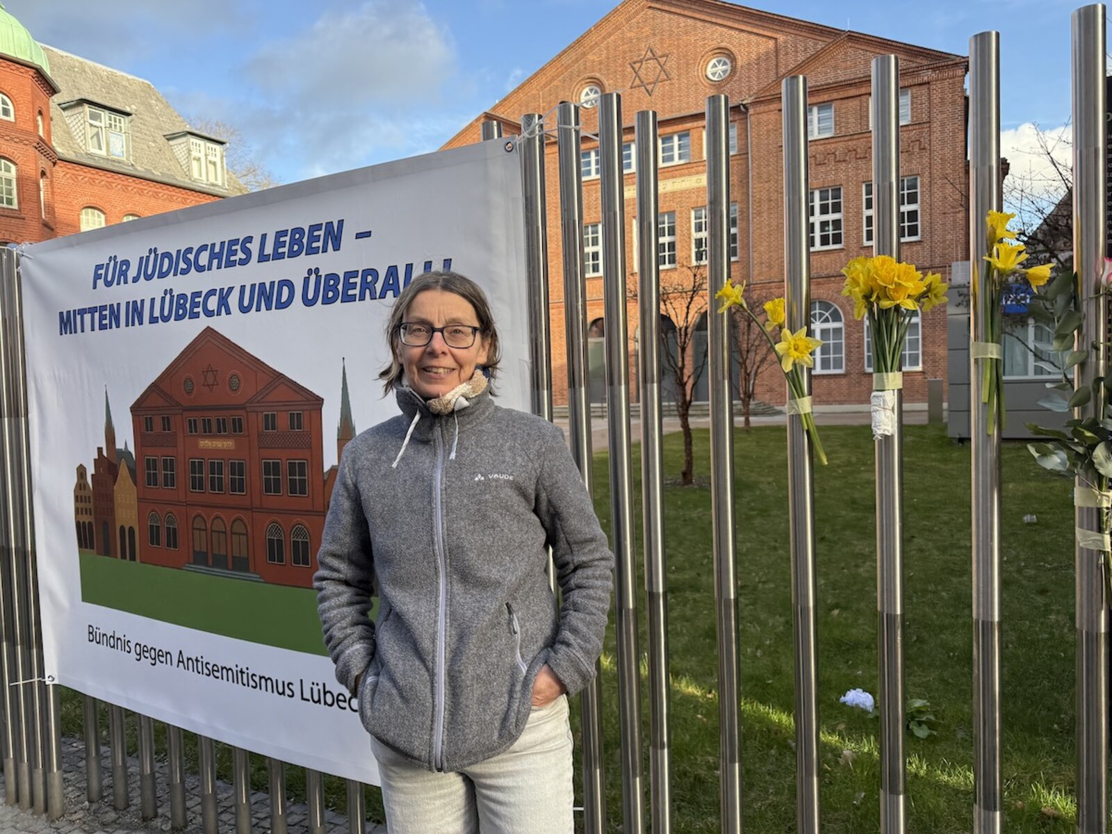 Genau deshalb organisierte das Bündnis gegen Antisemitismus Lübeck am 25. März 2025 die Gedenkveranstaltung “Für jüdisches Leben – mitten in Lübeck und überall!” direkt vor der Carlebach-Synagoge. Lübeckerinnen und Lübecker kamen zusammen, um Blumen am Zaun zu befestigen, innezuhalten, zu gedenken und miteinander ins Gespräch zu kommen.