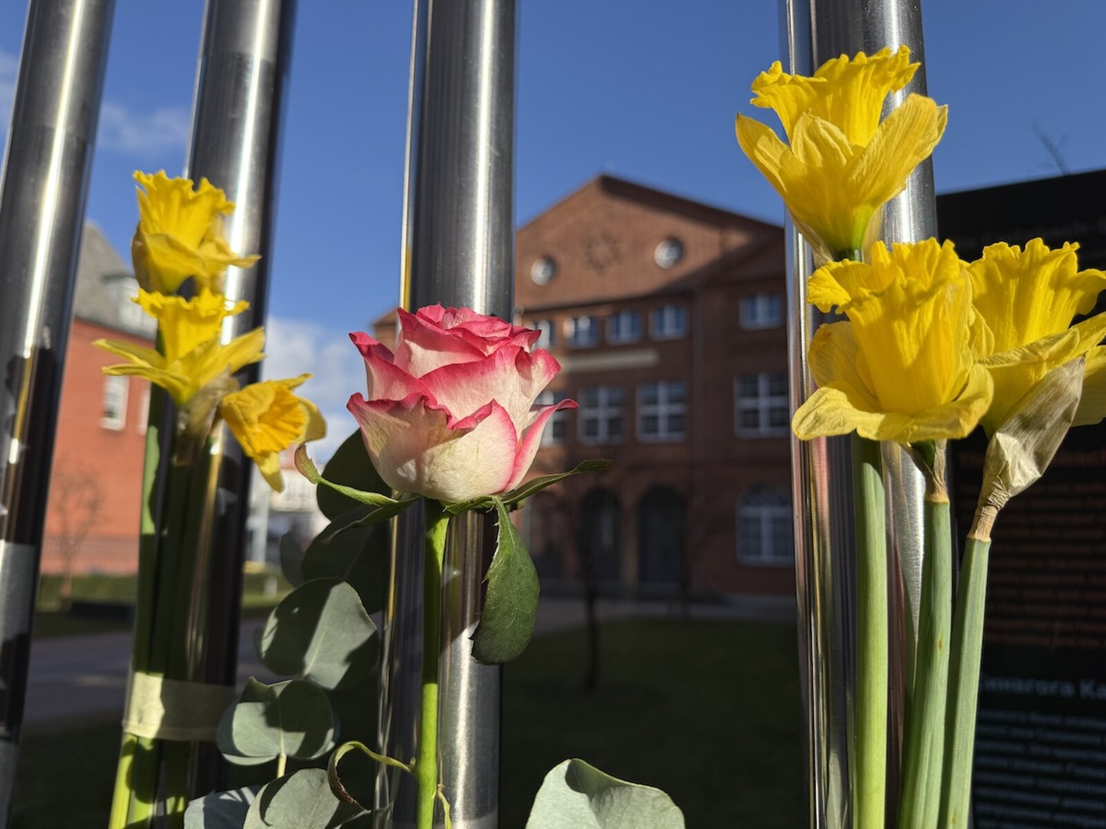 Auch junge Menschen beteiligten sich: Die Konfirmandinnen der Lübecker Domgemeinde, Hilde Lilitakis und Maria Grotkopp, brachten Narzissen am Zaun der Synagoge an und setzten damit ein Zeichen gegen das Vergessen. “Für uns ist es wichtig, im Rahmen unseres Konfirmandenkurses hier zu sein, um die jüdische Geschichte besser zu verstehen”, sagen sie.
