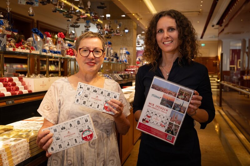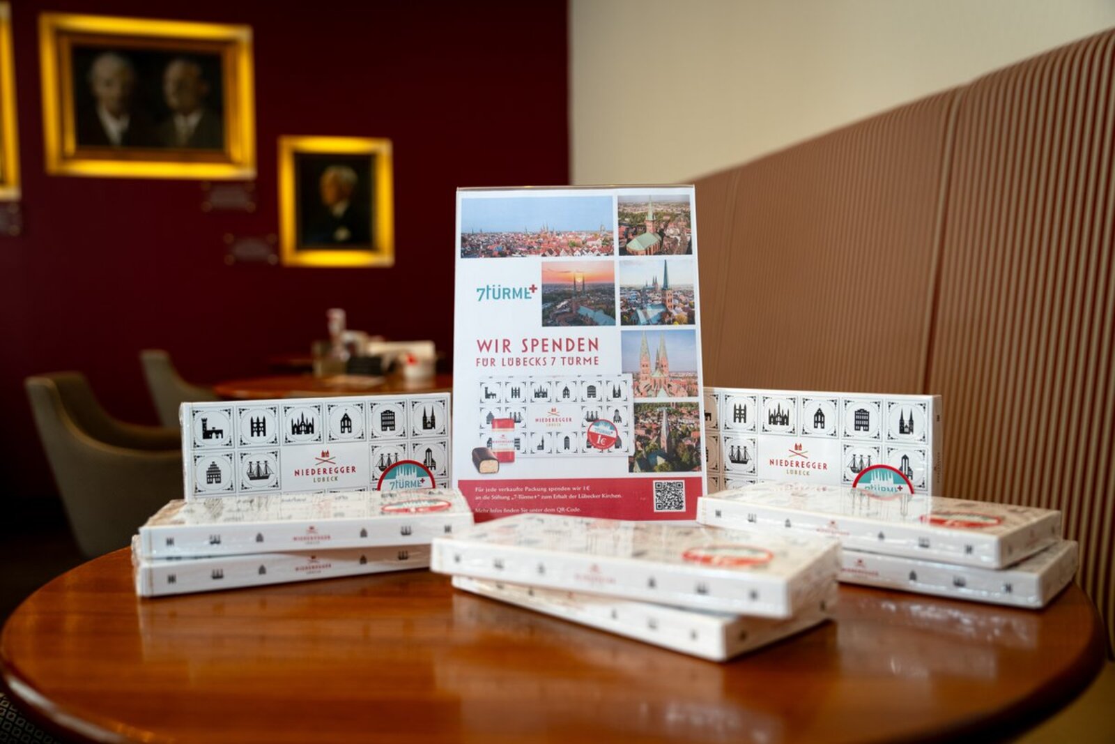 ​Im traditionsreichen Café Niederegger ist jetzt (12. Juli 2024) ein neues Unterstützungsprojekt vorgestellt worden, das den Erhalt der fünf Lübecker Altstadtkirchen unterstützen soll. Theresa Mehrens-Strait, die geschäftsführende Gesellschafterin von Niederegger, präsentierte gemeinsam mit Lübecks Pröpstin Petra Kallies die Verkaufsaktion, deren Erlös der in Gründung befindlichen Stiftung 7Türme+ zugutekommen wird. Pro verkaufter Packung spendet das Unternehmen einen Euro an die Stiftung.
