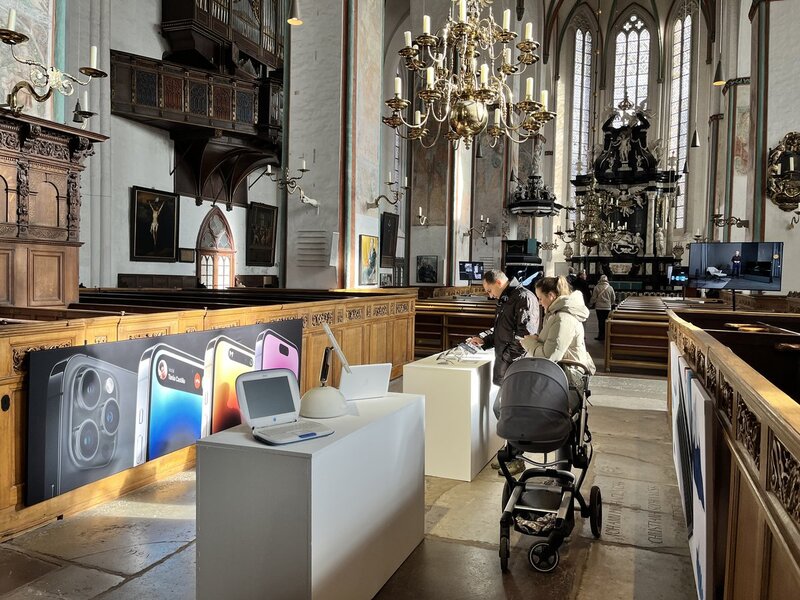 Kann diese Ausstellung überhaupt provozieren und vor allem wer provoziert wen?Können also technische Geräte, die, das gebe ich gern zu, von hoher Qualität und enormer Ästhetik geprägt sind, können diese Geräte, die eine Halbwertszeit von gerade einmal hoch gerechnet zehn Jahren haben, einer Kirche, wie St. Jakobi etwas anhaben, die auf 800 Jahre lebendige Geschichte zurückblickt.