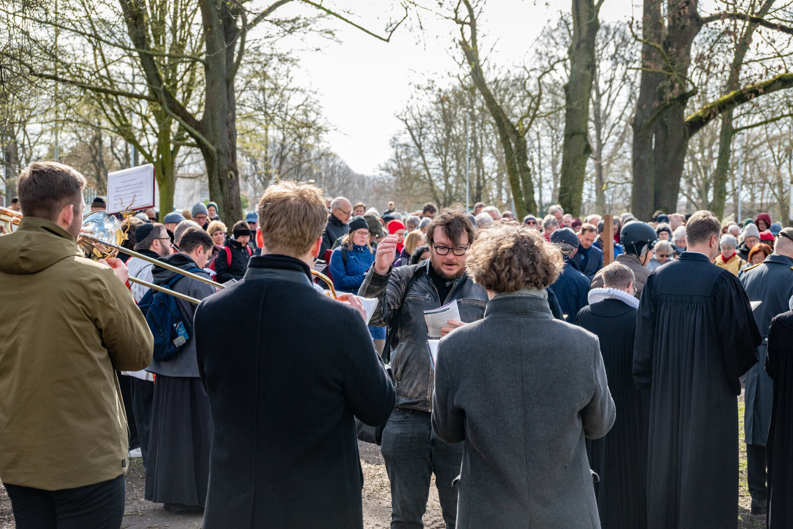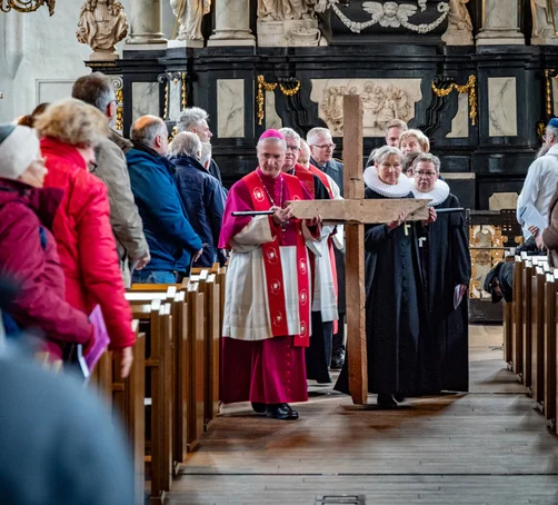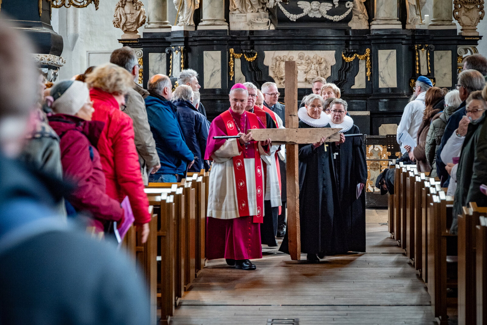 Fehrs rief dazu auf, nicht wegzusehen: „Nicht das Weite suchen, nicht wegzappen. Hinsehen. Heute, an Karfreitag, in ganz besonderer Weise.“ Es dürfe keine Gewöhnung geben an Krieg, Zerstörung und Gewalt: „Das vergossene Blut klagt die Mächtigen an: Sucht Wege zu einem gerechten Frieden.“