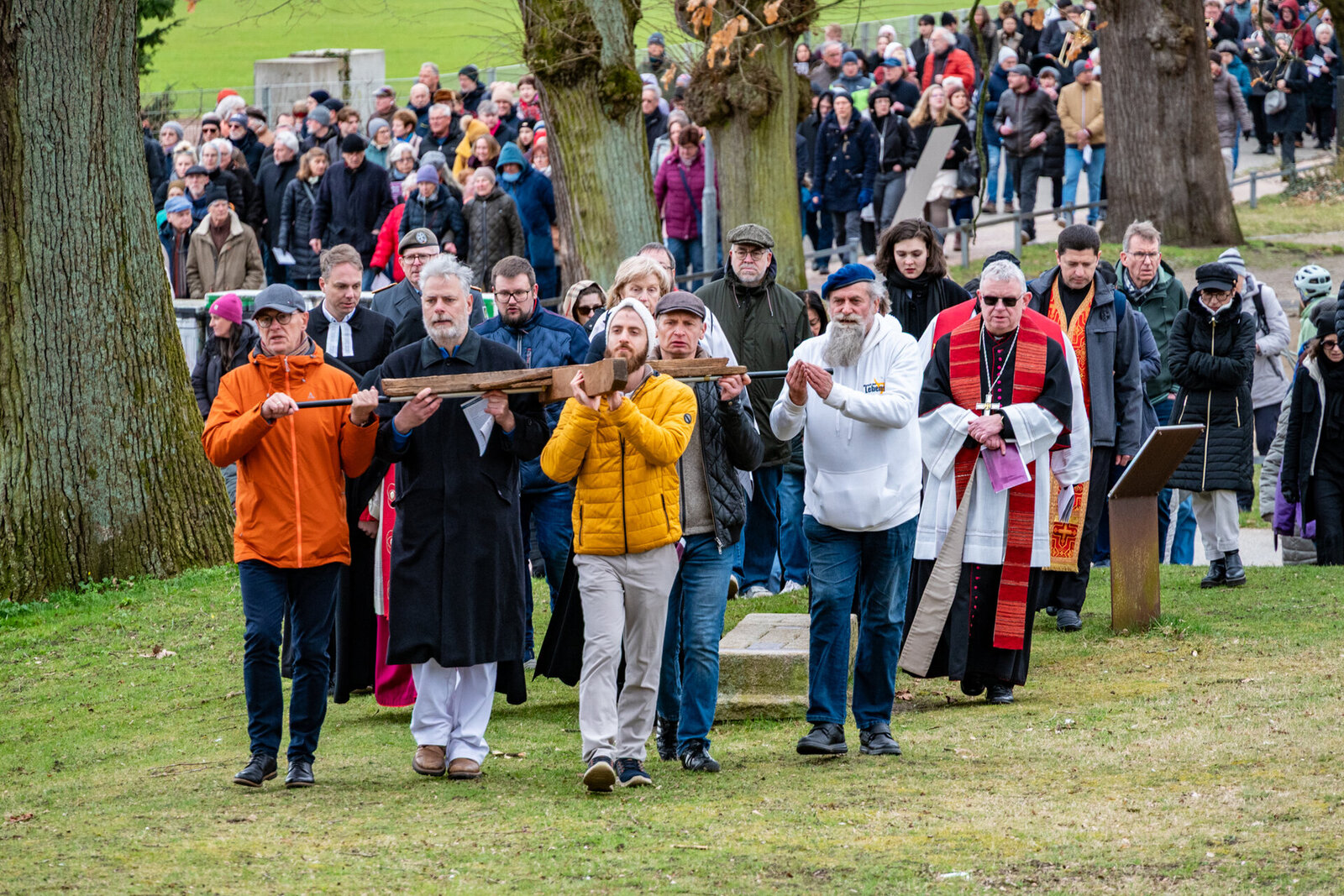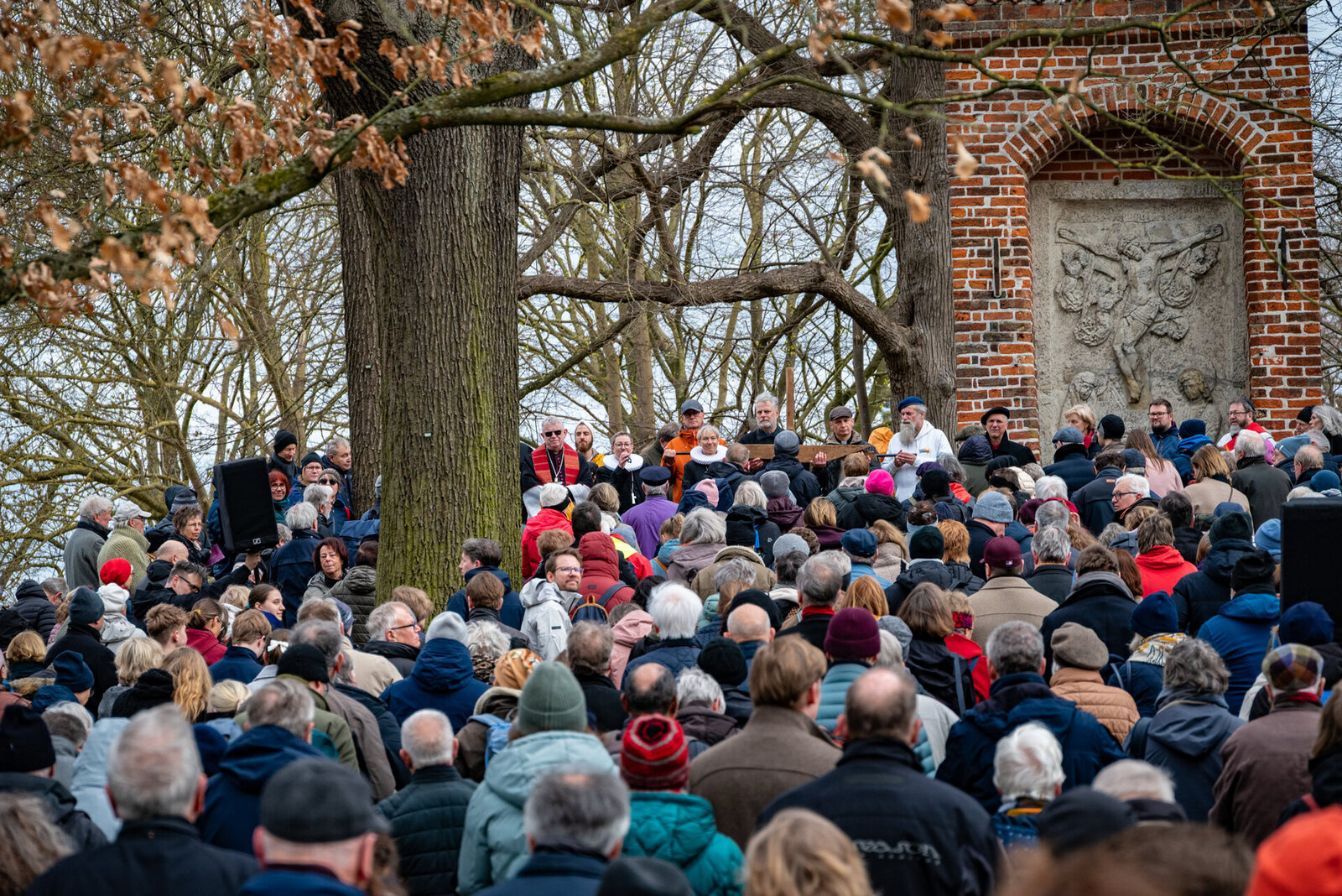 Am Jerusalemsberg, dessen Hügel bereits im 15. Jahrhundert als Nachbildung der Kreuzigungsstätte Jesu aufgeschüttet wurde, fand der Kreuzweg seinen eindrücklichen Abschluss. Dort erinnerte Bischöfin Fehrs daran, wie gegenwärtig das Leiden ist: