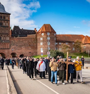 Vom Start an St. Jakobi zu Lübeck bis hinauf zum historischen Jerusalemsberg wurde der Leidensweg Jesu unter dem Titel „Machtspiele“ mit aktuellen Erfahrungen von Ohnmacht, Gewalt und Hoffnung in Verbindung gebracht. Besonders sichtbar wurde dabei: Der Kreuzweg ist ein offenes Zeichen für die Stadt. Bürgerinnen und Bürger – unabhängig von Konfession oder religiöser Bindung – konnten sich beteiligen und das Kreuz auf einzelnen Abschnitten des Kreuzwegs selbst tragen.