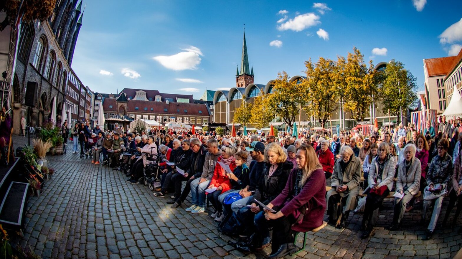 500 Menschen feiern auf dem Markt in Lübeck Erntedankfest. In dem Open-Air-Gottesdienst, geleitet von Marienpastor Robert Pfeifer und St.-Jakobi-Pastorin Bärbel Reichelt, feiert zugleich der 7Türme+ Kalender 2025 seine Premiere. Der Kalender steht unter dem Motto „Perspektivwechsel“ und verspricht nicht zu viel: „Es sind zwölf außergewöhnliche Motive, die einen ganz neuen, immer wieder sogar atemberaubenden Blick auf unsere sieben Türme ermöglichen“, sagt Ralf Nagel, Projektleiter von 7Türme+. Die Aufnahmen stammen von dem Lübecker Fotografen und Filmproduzenten Oliver Beck. „Die fünf Altstadtkirchen faszinieren mich seit meiner Kindheit. Sie symbolisieren für mich gleichermaßen Geschichte und Glauben, verkörpern Sicherheit und Beständigkeit, zugleich strahlen sie Erhabenheit und Lebendigkeit aus“, sagt der 56-Jährige.