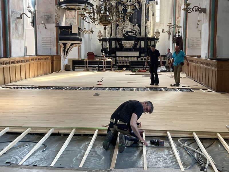 Vor fünf Jahren hatten in der Gemeinden die ersten Überlegungen für eine flexiblere Bestuhlung im Zentralbereich des Hauptschiffes begonnen. Dann starteten, stets in den Sommermonaten, die Experimentierphasen: „Wir haben unterschiedliche Versuchsanordnungen bei gottesdienstlichen und musikalischen Veranstaltungen getestet“, berichtet Jedeck. Zunächst löste man die Bänke vom Podest und schraubte die Unterbankheizungen von den Heizungszuläufen ab. 2018 und 2019 wurde der Mittelgang durch ein Podest erhöht und auf die allgemeine Höhe der Bänke angepasst.