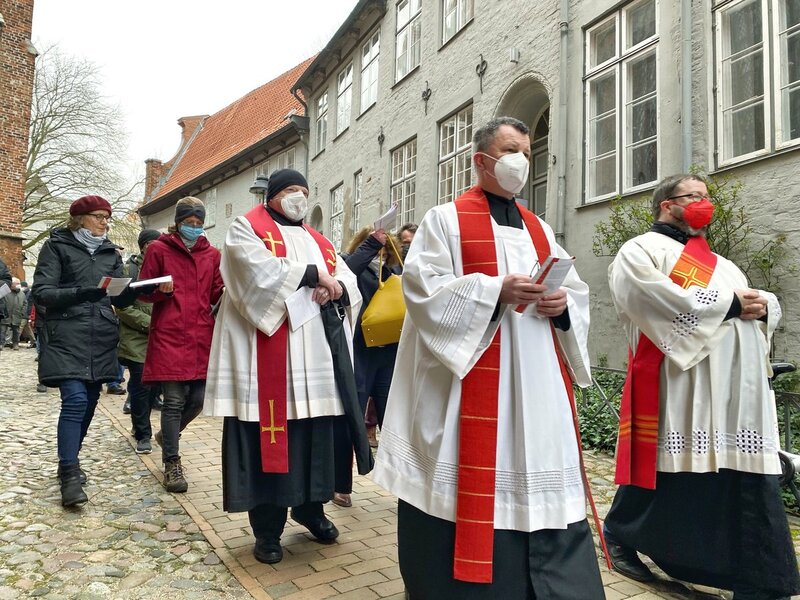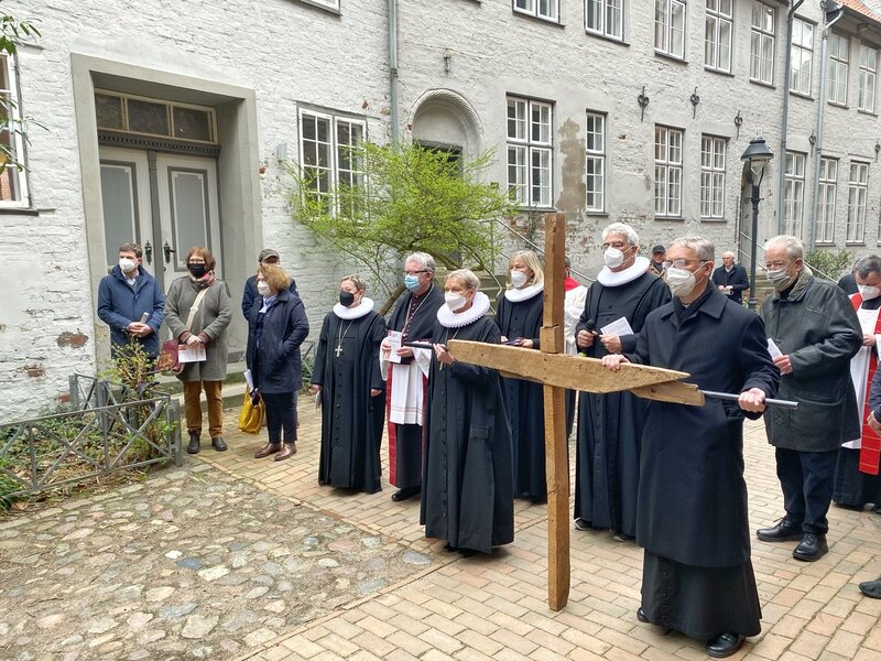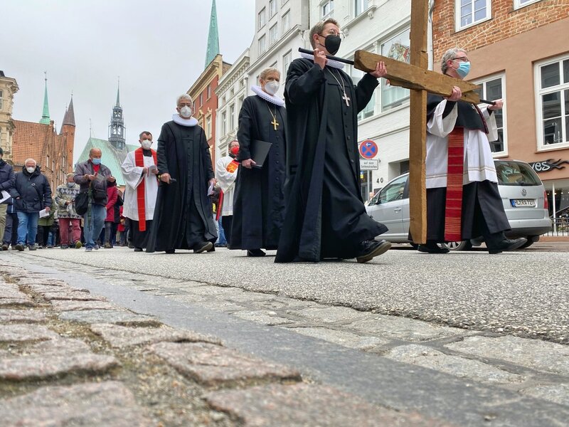 Gemeinsam mit Bischöfin Kirsten Fehrs, Bischöfin im Sprengel Lübeck und Hamburg, dem katholischen Erzbischof Dr. Stefan Heße und dem ehemaligen Ministerpräsidenten Björn Engholm startete die ökumenische Prozession an der Kirche St. Jakobi, um an das Leiden und Sterben Jesu zu erinnern. Ebenfalls mit dabei: unter anderem Pastor Lutz Jedeck (St. Jakobi), Pastorin Kathrin Jedeck (St. Jakobi) und Propst Christoph Giering (Propstei Herz Jesu). Hunderte Gläubige kamen in diesem Jahr zu der Prozession durch die Lübecker Innenstadt.