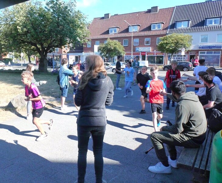 Die Kirchengemeinde hatte einen Pavillon vor der Kirche aufgebaut, an dem Getränke verteilt wurden. "Wir sind beeindruckt von der Idee und dem Engagement der Schule und natürlich von der Beteiligung so vieler Aktiver. Ich finde, es ist ein sehr gutes Zeichen für die Verbundenheit im Stadtteil", lobte Pastor Martins.