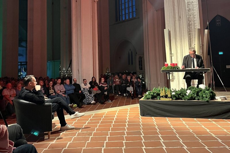 Lübeck. Schon beim Betreten der Petrikirche lag am 19. September 2025 ein Hauch von Weihnachten in der Luft: Vor dem Eingang begrüßte ein Blockflötenquartett die Gäste mit festlichen Melodien, drinnen funkelten geschmückte Tannenbäume, und es duftete nach Punsch und Lebkuchen. 700 Besucherinnen und Besucher waren gekommen, um Pastor Dr. Bernd Schwarze und den Bestsellerautor Sebastian Fitzek bei einer besonderen Lesung zu erleben.