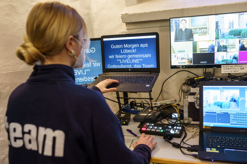 Freitagabend, kurz nach 17 Uhr. Rushhour in Lübeck. Rund um die Altstadt staut sich der Verkehr. In der Ratzeburger Allee geht es für Autofahrer nur schrittweise vorwärts. Die Hansestadt startet ins Wochenende - mit Ausnahmen wie Jule Klapproth, Jakob Gutsche und etwa 30 weiteren ehren- und hauptamtlichen Akteuren. Für sie beginnt die heiße Phase - die Proben für den Online-Gottesdienst #liveline, der am Sonntag live aus der St.-Jürgen-Kapelle auf tausende Fernseher und Laptops in ganz Deutschland gesendet werden soll.