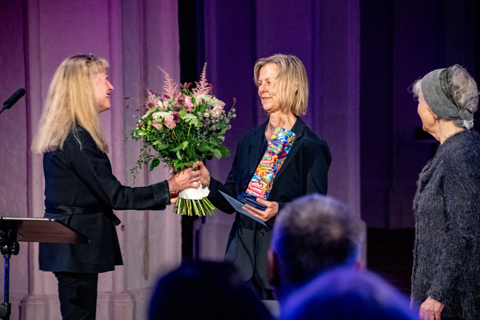Antje Peters-Hirt von der Mellingen-Stiftung und Uta Harig, Witwe von Pastor Günter Harig, überreichten Susanne Tolkmitt die farbenprächtige Preisskulptur des Künstlers Stephan Jäschke, das Preisgeld und einen großen Blumenstrauß. Bernd Schwarze bat mit einem Augenzwinkern, die Skulptur in "hundespieltriebsunerreichbarer Regalhöhe" zu platzieren.