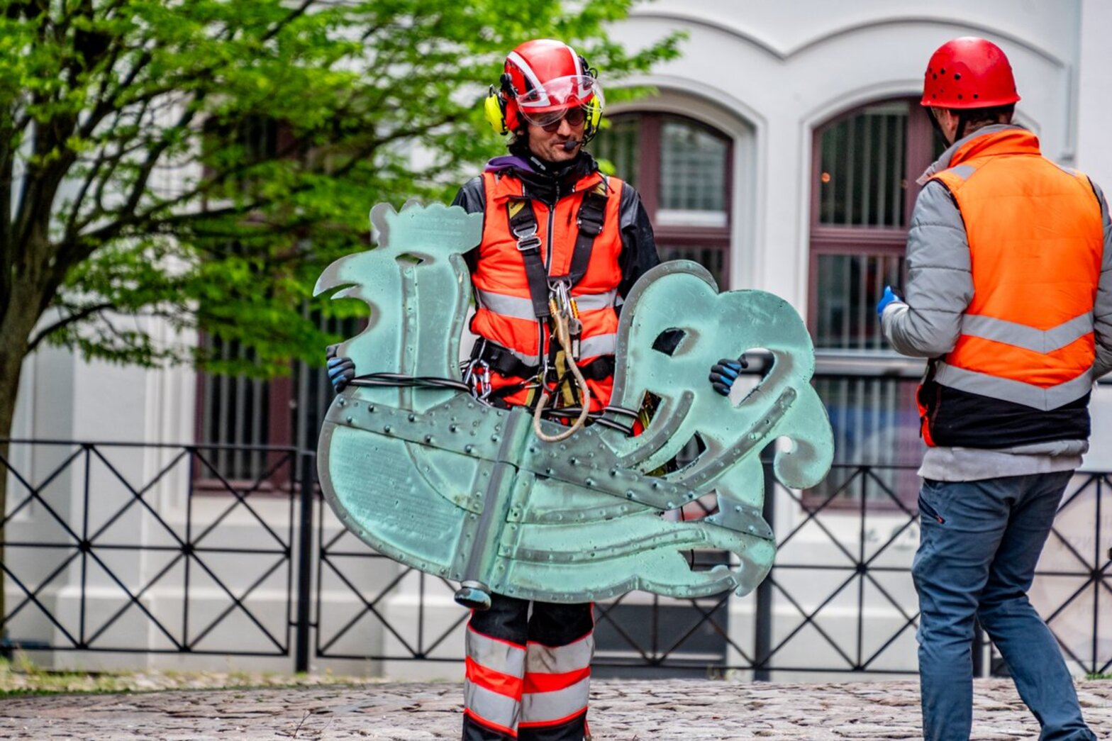 Der Kletterer trägt den rund 40 Kilogramm schweren Wetterhahn von St. Jakobi zu den Zuschauenden.