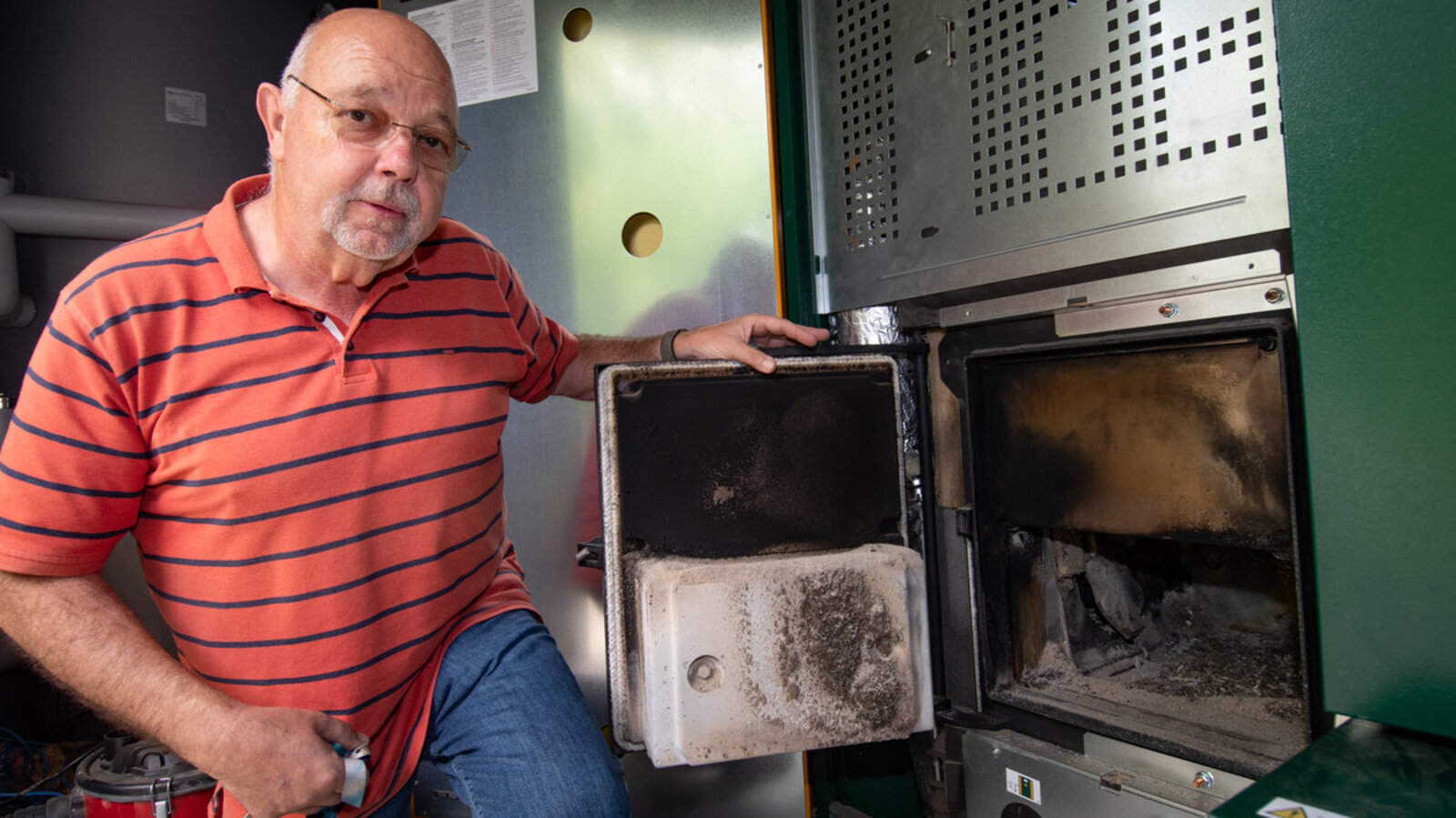 Blick in das Herzstück der Anlage: Olaf Dey zeigt den Ofen des Holzhackschnitzel-Kraftwerks.