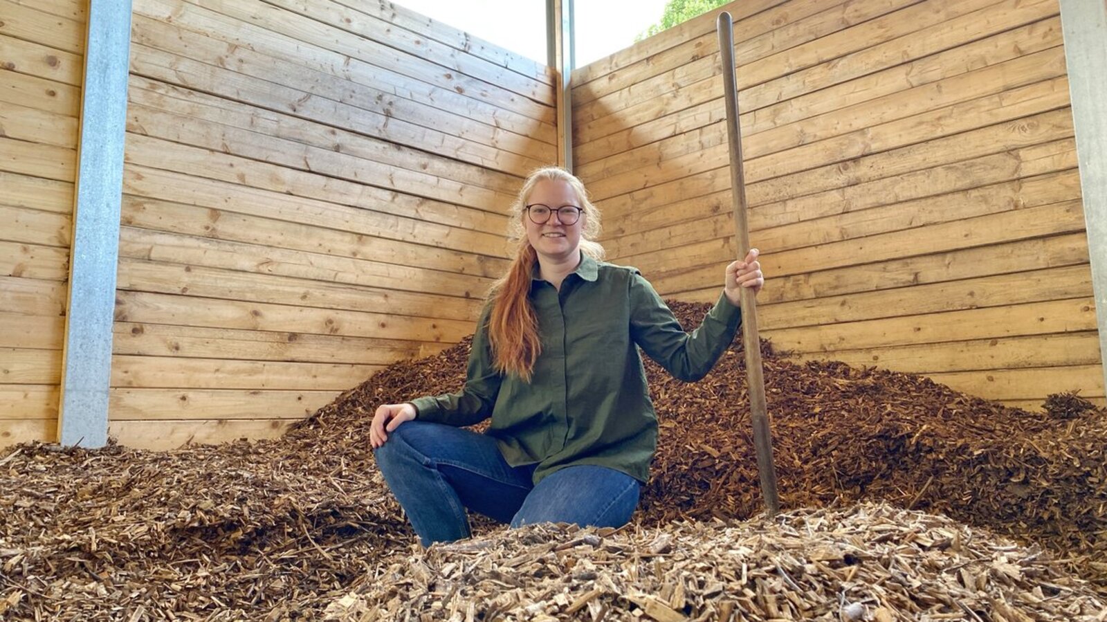 Lütaus Pastorin Johanna Lembke-Oberem zeigt das Holzhackschnitzel-Lager der Anlage.