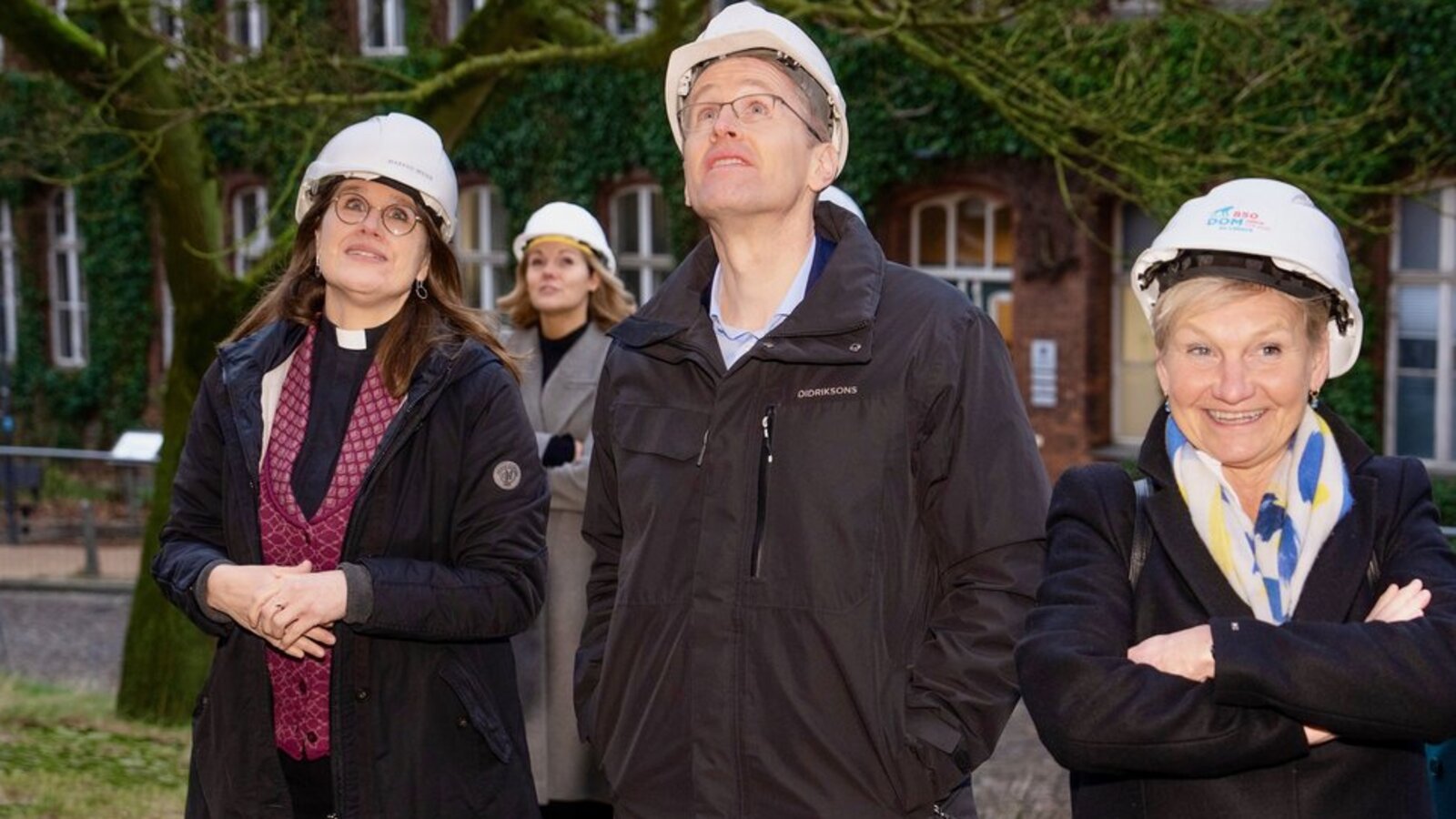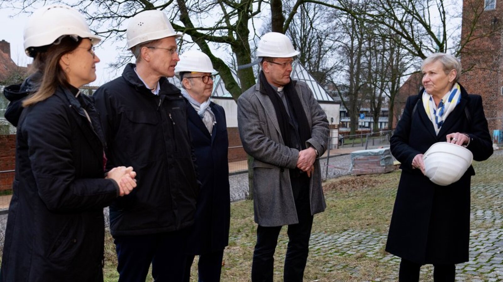 Gemeinsam mit Kirsten Fehrs, Bischöfin des Sprengels Hamburg-Lübeck der Nordkirche und Ratsvorsitzende der EKD, informierte sich der Ministerpräsident über die anstehenden Baumaßnahmen am Dom und in St. Marien zu Lübeck. Beide Großprojekte werden in diesem Jahr starten. Ein weiterer Schwerpunkt: die Arbeit des Projekts 7Türme+, das ab Mitte 2025 als bürgerliche Stiftung den dauerhaften Erhalt von St. Marien, St. Aegidien, St. Petri, St. Jakobi und dem Dom zu Lübeck sichern soll. Das Land Schleswig-Holstein und die Nordkirche werden Mitstifter von 7Türme+.