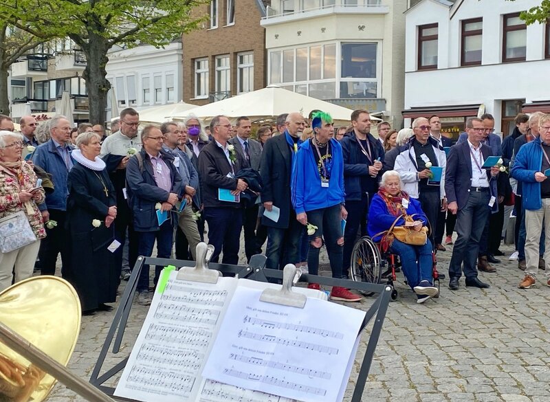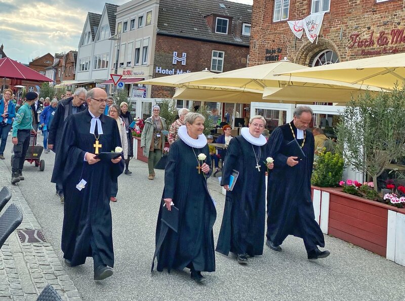 Zur Landessynode der Nordkirche in Travemünde ist ein außergewöhnlicher Gottesdienst gefeiert worden: Unter dem Motto „Suchet Frieden“ pilgerten mehr fast 200 Menschen am Freitag, 6. Mai 2022, in einer öffentlichen Prozession von der Kirche St. Lorenz an den Strand vor der Nordermole.