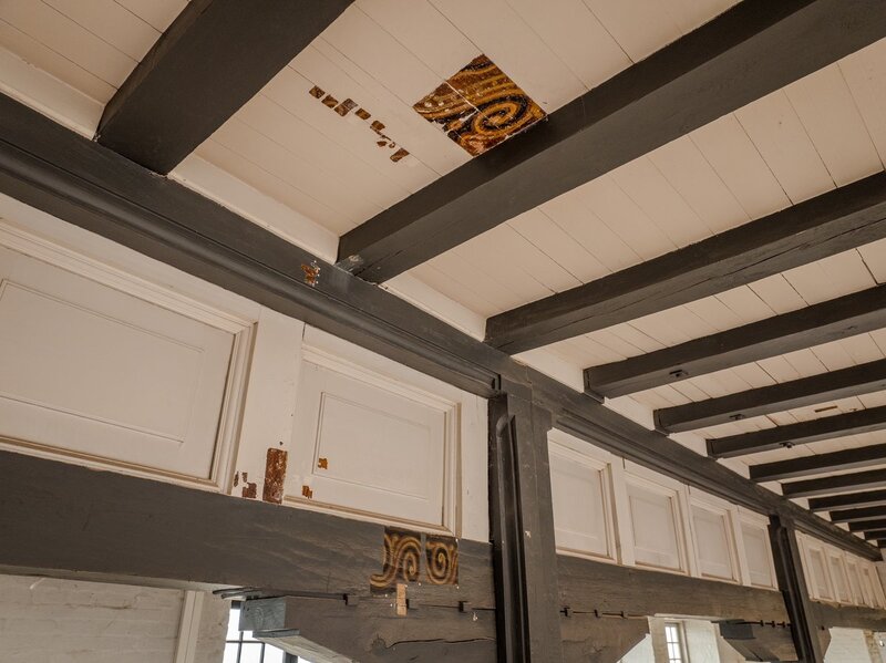 Kunstvolle Malereien, meist in Schnörkelform, zieren Teile der Kirchendecke und Balken, die die Kirche durchziehen. Und das ist etwas sehr Besonders, denn St. Johannes ist eine Arbeiterkirche. 1910 gebaut, war sie für die Arbeiter im Stadtteil gedacht, die hier im Hochofenwerk und später im Schiffsbau malochten. Kunstvolle Verzierungen aber waren in Arbeiterkirchen eigentlich gar nicht üblich.