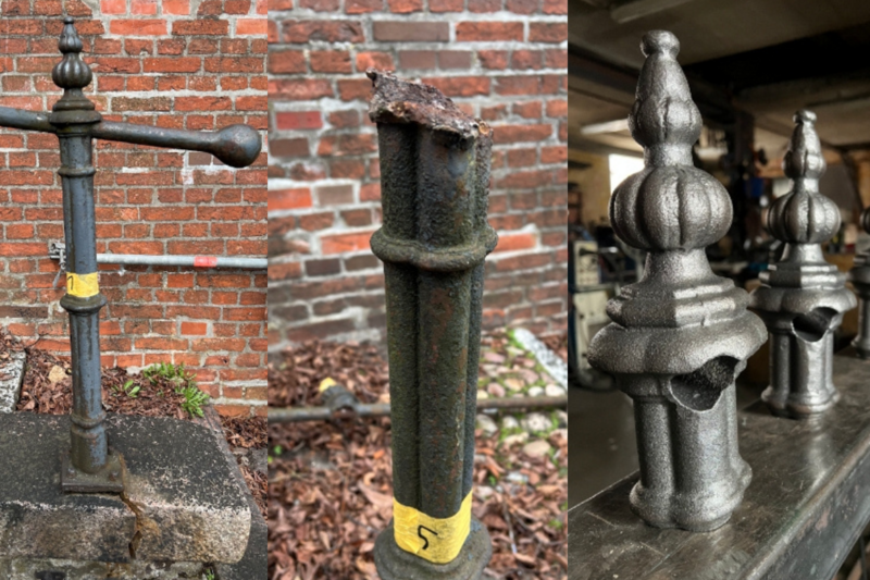 So sei es früher durchaus beabsichtigt gewesen, dass die Handläufe eines gusseisernen Geländers in den Geländerpfosten etwas Spielraum hatten und klapperten, damit sich das Material bei Sonneneinstrahlung etwas ausdehnen kann. Fehlerhafte Schweißarbeiten hätten in der Vergangenheit zu den erheblichen Schäden beigetragen, sagt Restaurator Eingrüber: “Es wurde wohl in guter Absicht der Handlauf an die gusseisernen Pfosten geschweißt, damit er nie mehr ‘klappere’”, so Eingrüber weiter. Dies habe jedoch dazu geführt, dass die Kronen der historischen Pfosten teilweise abbrachen. Außerdem lösten sich einzelne Pfosten aus dem Mauerwerk. Das Geländer war nicht mehr sicher.