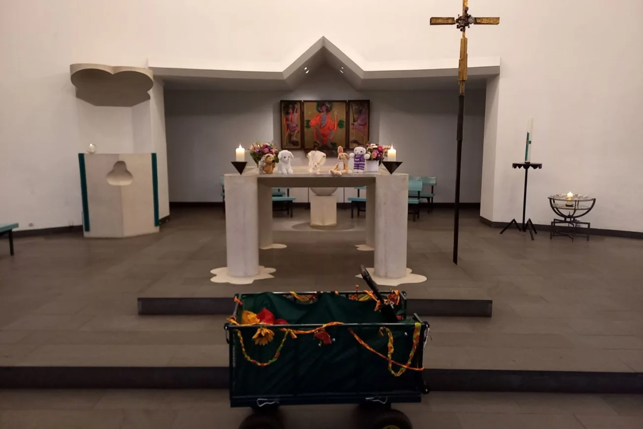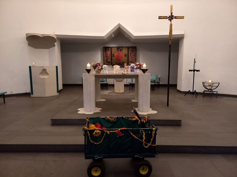 Einen Bollerwagen mit Nahrung haben sie auch gleich mit in die Kirche gebracht. Die Nahrung verteilen wir dann an Tafeln der Region.